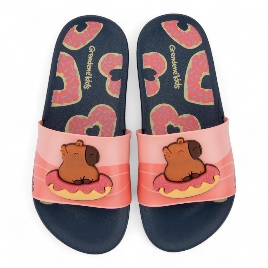 Apresentamos o Chinelo Slide Capivara, onde esse simpático animal é o grande destaque. O design conta com versões em maxi plastisol ou plastisois que remetem à ideia divertida dos pins, além de um aplique exclusivo cheio de charme.