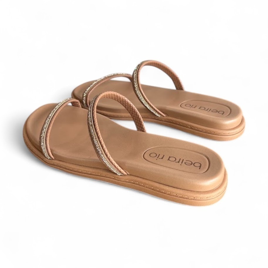 Uma tendência que está dominando a estação são as papetes com detalhes brilhantes, que elevam o visual do básico ao sofisticado, trazendo charme e modernidade ao look. O cabedal é feito em material sintético de alta qualidade, e as tiras adornadas com strass conferem um toque de elegância.